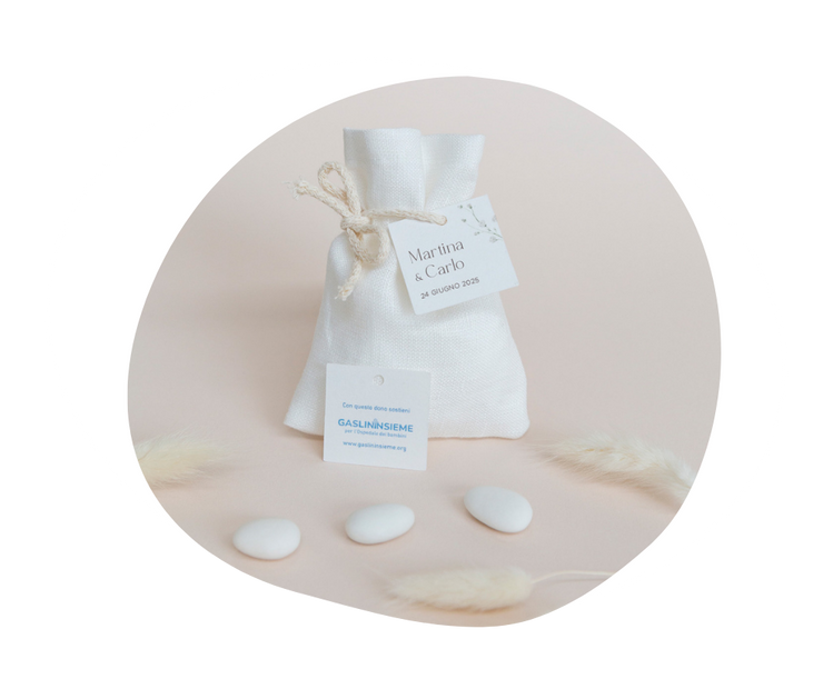 Le bomboniere solidali Gaslininsieme sono personalizzabili, potrai scegliere tra tanti colori, indicare i dettagli dell'evento e il messaggio di solidarietà e amore che vuoi comunicare ai tuoi cari.